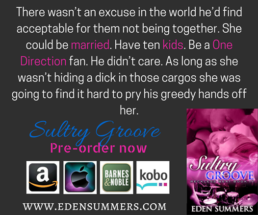 A profoundly emotional story that had me distracted for hours on end. A story that hit close to home, surprised me, delighted me, and moved me. Eden Summers had me under her spell in Sultry Groove, so much so, that I never wanted it to end. This series, these characters, this emotional pull I get while reading these books, THIS RIGHT HERE, is why I read. This is why I review. THIS is why these stories stick with me and never let go.