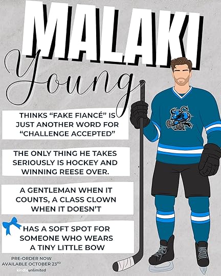 Malaki Young is the charming playboy pro hockey player. Reese is a fiercely independent single mom struggling to stay afloat. Malaki offers a fake engagement as a solution to keep her toxic, obsessive ex away. They are PERFECTION. I immediately fell in love with them (and Charleigh 👧🏻).