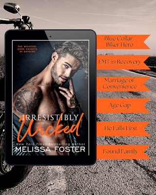 I absolutely loved Irresistibly Wicked by Melissa Foster; it is an incredible marriage of convenience love story. It is the seventh book in her The Wickeds: Dark Knights at Bayside series. I love the series and am looking forward to reading other books in the series. Melissa Foster has once again shown that she is an amazing storyteller. I love that she continues to write the books that I love to read and is a must-read author for me. I was hooked from the first few pages, it was impossible to put Irresistibly Wicked down, and I loved every moment on every page. Who does not love hot sexy men, strong females, loving families, and friends, who always support one another? One of my favorite parts is that I love how the title of the book is incorporated into the love story. Irresistibly Wicked is the story of Shauna Flores, EMT and Alexander “Zander” Wicked, who works for his family’s business, Cape Renovations. On the morning of New Year’s Eve, after spending the night with two women, Zander runs late for work and his car is hit by a truck running by a red light. Shauna is driving through an intersection and sees a truck hit a car and run it off the road. She calls 911 and pulls the driver from the burning car, and stays with “Zeke” the name Zander gives her until the first responders arrive. Shauna visits Zander while in a medially induced coma in the ICU. She then runs into him at the local convenience store and later when Zander arrives at her apartment for repairs. Zander shows up at the firehouse and Shauna reveals that she and her roommate are best friends and former addicts, who grew up in homes with parents who had substance abuse issues. Zander notices Shauna’s tattoo and they realize their connection to one another. Shauna believes that Brian is using again. Zander unexpectedly arrives at her house shortly after an encounter with Brian that leaves Shauna with bruises on her arms. Zander takes her to his home, to keep her safe and away from Brian. Shauna reveals that her grandfather left her an inheritance with stipulations, one being that she had to be married for two months. Shauna and Zander agree to a marriage of convenience, so that Shauna has the funds to put Brian in rehab. Zander makes the arrangements for Brian’s rehab. Love the engagement ring that Zander chose for Shauna. Zander takes Shauna shopping to purchase something for her to wear for their wedding, and buy wedding rings. Only Zander’s family and Shauna’s boss, Captain, Rodney Chaney know the truth about their marriage. I love the surprise that the Wickeds have for Shauna and Zander, and how the women support her. Initially, Shauna is overwhelmed by all the Wickeds and all their love. As Shauna, and Zander spend more time together as husband and wife, and renovating his home things change between them. Conversation between Zander and Shauna flows so easily, with playful innuendos and naughty banter, with dirty talking Zander constantly flirting with Shauna. Their chemistry is one of my favorite parts of the book as well as Zander’s nickname for Shauna. Another favorite part is the irony of the tattoo on Zander’s finger. I love that they each share secrets with one another that they never shared with anyone before. Shauna shares secrets about her childhood, and Zander shares secrets about his Dyslexia. Shauna and Zander both have issues with trust. The surprise honeymoon that Zander plans for him and Shauna is my favorite part of the story, I love all the details of the honeymoon and how their relationship changed. I love Zander’s cat, Kitty and Shauna’s relationship with her. I love how the Wicked women embrace her and include Shauna in their women’s book club. I love the songs selected throughout the story. A plot twist puts their relationship in jeopardy and causes Shauna to move back in with Brian, but I love the outcome of the plot twist. I love everything that Zander does for both Shauna. I love that Zander and Shauna finally admit their true feelings for one another. I love the renovations to Zander’s home, especially the pole that Zander had installed for Shauna. I love that the ending of their love story it is the perfect ending of Shauna and Zander’s love story. I love how both Zander and Shauna change because of their love for one another, especially how Shauna realizes she is not alone and all the support that the Wickeds have given to Brian during his recovery. Another favorite part is the epilogue and Madigan and Tobias’s wedding. I think dirty talking Zander might be my favorite Wicked. I loved the heart-to-heart conversation that Shauna has with Zander’s mother. I really enjoy how the book is told from the perspective of the main characters. I love getting the insight and feelings from the different characters. Irresistibly Wicked is a marriage of convenience love story and is filled with heartbreaking and heartwarming moments. I love the lighter moments where I find myself smiling and laughing out loud. Irresistibly Wicked is filled with all those things that we have come to love and expect in a love story, Melissa Foster did not disappoint, especially with the poignant and bittersweet moments as well as plot twists and surprises that filled this page turner. I love how Melissa Foster always manages to create the "perfect" heroine, who is a strong, sassy woman on her own, to balance out the sexy, swoon worthy biker. I love the characters and the family dynamic in Irresistibly Wicked the characters feel like family and friends. It felt like a family reunion, catching up with the other characters in the series. I enjoyed all the interactions between the Wicked siblings and cousins, and Shauna’s interactions with them, it feels like real family love and makes me laugh at their teasing. I love that Shauna finally has girlfriends. I loved all the characters in Irresistibly Wicked, especially Junie and Rosie. Who does not love family and friends that always have e