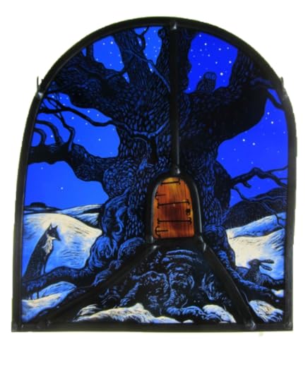 Poet John Masefield's 1935 British Empire-era fantasy finds twelve-year-old Kay Harker home from his boarding school just in time to help a magical old Punch and Judy showman. At least, that seems to be what happens. The plot's pretty convoluted. But the images Masefield conjures up are gorgeous. UK stained glass artist Tamsin Abbott's gorgeous panel of Masefield's She-Oak Tree