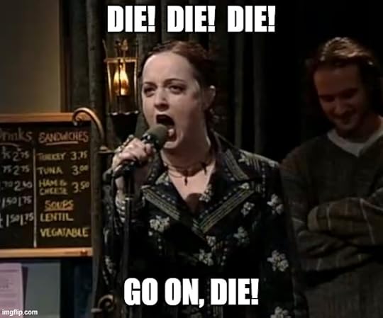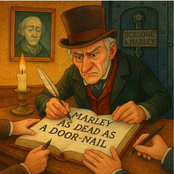 Dead as a door nail, say it twice.What the fuck are you even talking about? And don't try to explain it to me in the comments. I know exactly what the reference is. There's a wonderful paragraph in the source material, the second one in the book, in fact, where Dickens discusses door and coffin nails.