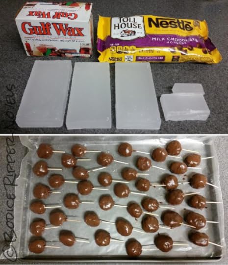 Chop the wax finely, add it, along with the chocolate, to a small bowl so you can melt it using the double boiler method. Sit the small bowl on top of a small pot, 1 qt. size if you have one, that's filled with 1" of simmering water. The bowl that's on top shouldn't touch the water beneath it. Keep stirring the wax/chocolate mixture until all the wax has melted. This could take ten minutes or so. I then pour the mixture into a very small (13 oz.), deep bowl (don't use a shallow bowl) and dip my candy into that. I also stick the toothpick into the side of the very cold candy because it'll leave a small hole when you remove it and the hole looks better on the side of the candy than on the top. Cover any remaining chocolate tightly and store in refrigerator. It will probably keep for a few months. To reuse, uncover and melt in the microwave.