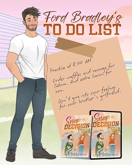 SNAP DECISION is a spicy Pro Football, Brother’s Ex, Friends to Lovers Romance from Amazon Top Ten Bestselling author Lisa Suzanne.