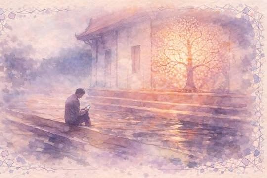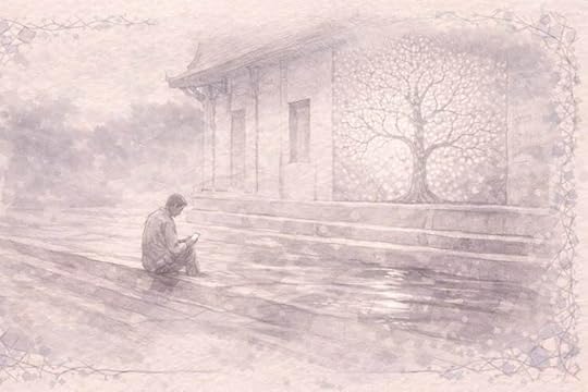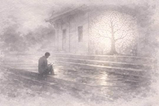 At Wat Xieng Thong after rain, a solitary figure, a phone, and the Tree of Life hold the book’s central tension in one suspended image: grief on the verge of becoming witness, fracture, and form.