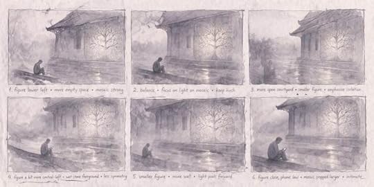 Early compositional studies testing how solitude, imbalance, and the visual pull between figure and mosaic could carry the painting’s emotional argument before color ever entered the page.