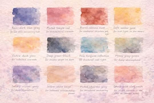 A restrained palette study working out the final painting’s emotional logic through bruised blues, muted temple reds, and fractured golds drawn from the cover’s world and the review’s mood.
