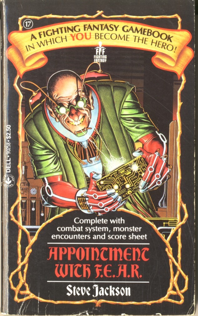 'Appointment with F.E.A.R.' is a Fighting Fantasy book which is a bit like "choose your own adventure" but for adults. You play a hero going on a quest of some kind, and you photocopy an adventure sheet from the back of the book to note down your health, strength, luck, equipment and so on, and roll dice for battles against monsters.