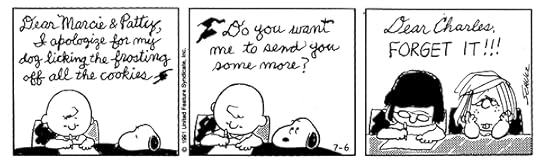 So now for the strip, which requires some setup. Usually every summer Schulz would seen Charlie Brown to summer camp. However in 1991, Charlie Brown decides not to go, and begins a correspondence with Marcie and Peppermint Patty, who have gone to summer camp. Something that not many people know/acknowledge in the later days of Peanuts is that Marcie has something of a crush on Charlie Brown and as such, Marcie suggests that they send Charlie Brown a letter from camp telling them he misses them. Charlie decides that he needs to send them some cookies in appreciation but while he goes to find a box to place them in, Snoopy licks the frosting out from the cookies (they are obviously Oreos or something akin to them.) Marcie and Patty then send a letter indicating that someone had licked the frosting out of the cookies (this is how we learn about Snoopy's transgression.) Charlie Brown decides he wants to make amends and sends a reply on July 6, 1991, which happened to be my sixteenth birthday: