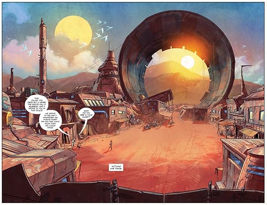 Nice art and an interesting set up for the story. The main character crash lands on an alien planet, manages to just barely survive the crash, and then is gut shot and left for dead. He wakes up three days later (or is it much longer?) in a ramshackle somewhat western sci-fi town in the wastelands of this backwards planet with no way off-world. There are so many questions the main character (and you) have, what was he running from, why was someone trying to kill him, who shot him, why are all these other people stuck on the planet, who are the aliens on the planet... and more. It's good opening arc because it makes you curious as to what happens next.