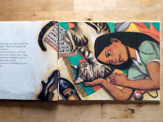 Woogie is a good luck cat. Because she has so many good luck gifts, her nine lives went fast. Woogie is striped with green, electric eyes. She helps Aunt Shelley win at bingo and locates missing earrings. She also has a propensity for getting into trouble- hiding under cars, getting stuck in a clothes dryer, and hunting birds. Yet, Woogie somehow prevails unscathed after all of these encounters. Combined with exquisite illustrations by Paul Lee, Harjo paints a picture of Native American life in Oklahoma that her readers are accustomed to. Only this story is told through the eyes of a girl and her special cat.
