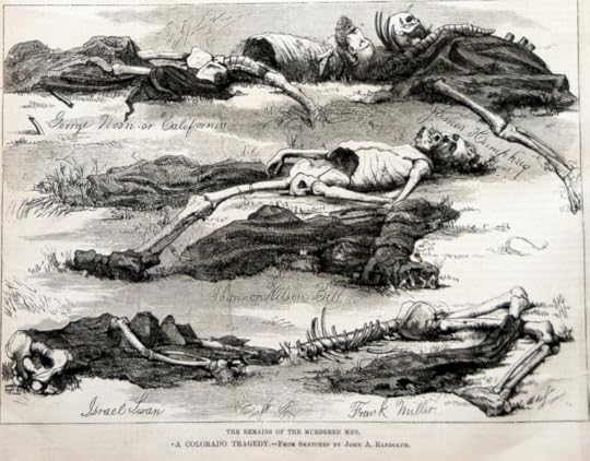 "The bodies were left at the campsite; however, the following August the remains were discovered by Harper’s Weekly Magazine Artist John Randolph on a bank above the Lake Fork of the Gunnison, just up from Lake City. Randolph reported the finding and, after being examined by the Hinsdale County Coroner, the skeletons were buried in a shallow grave near where they died.