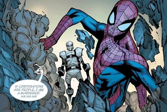 What we get instead is a fairly slight (four issues) trade paperback that deals with two concurrent arcs: a transient entity called The Ghost, with a hate-on for corporations and a series of anti-tech tools at his disposal, has invaded Parker Industries (the venture that Otto Octavius made when he had planted his mind in Peter Parker’s body during Superior Spider-Man, and when Peter got his body back he found he owned his own company and…just go with it) and threatens to bring it all to the ground – both ideologically, and the old-fashioned way.