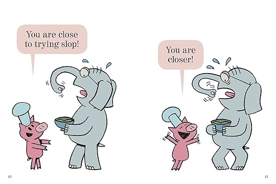 In this volume of the epic Elephant & Piggie saga, Piggie makes some slop (or, as she says, "yummy, yummy slop"). Gerald reacts as most would, taking in the sight and smell of this food and decides it's not necessarily for him. Piggie then tries to get him to try it.