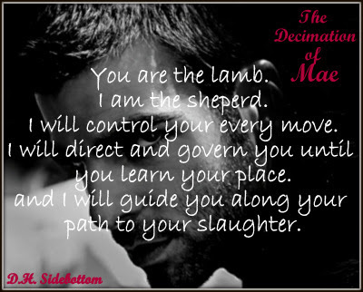 "You are the lamb. I am the shepherd. I will control your every move. I will direct and govern you until you learn your place. And I will guide you along the path to your slaughter."From the word go, "The Decimation of Mae" pulled emotions from me. I felt so much sorrow and hurt which then morphed into anger and frustration and even hatred on so many occasions. And even now, after I've finished up, I still can't stop thinking about the story. How could a book be so brutal, so ugly, so tragic, so horrific for the most part yet bring me to my knees at the end? I don't know how D.H Sidebottom did it but my heart ached, it broken and eventually it shattered into a million pieces, the tears that had threatened to fall finally making their appearance during the last 10%.
