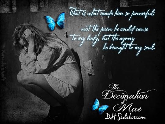 "I will break you, Mae," he hissed in my ear, his hot breath torture against my cold, damp skin."I will possess you so entirely that you will ask for permission to breathe"D.H Sidebottom wrote an amazing book in "The Decimation of Mae" and I was 100% invested the story. Her writing was so visual, it made my stomach turn at times but I wouldn't have it any other way. It was perfect and really helped to bring Mae's story to life. This was one hell of a mind fuck of a read and I need more.... I want inside "the devil's head!" Crazy I know but I need answers to questions I have. Answers only this man could give me. Unfortunately, told solely from Mae's POV, I got very little from him... very little indeed, the author holding the cards on this character very close to her chest.. I wonder why? Lol