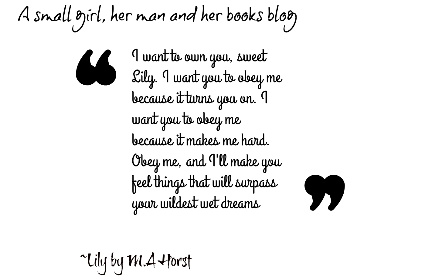 “I want to own you, sweet Lily. I want you to obey me because it turns you on. I want you to obey me because it makes me hard. Obey me, and I’ll make you feel things that will surpass your wildest wet dreams.”