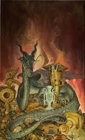 Light flooded the expansive cavern, pouring in from a massive hole in the ceiling. [...] Sunlight reflected off what could only be millions of gold coins. They completely covered the floor, with scattered piles forming a golden landscape of hills and valleys. At the edge of the light, Madja could make out what looked like an underground lake. The surface of the water had a strange iridescence and seemed to glitter like diamonds.