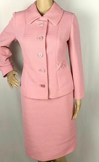 She had dressed with care in a new Crimplene two-piece of a delicious shade of salmon pink. The flared skirt was calf-length while the short jacket was double-breasted and scalloped on the neckline. With it she wore her double string of pearls and a beige llama coat