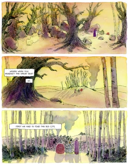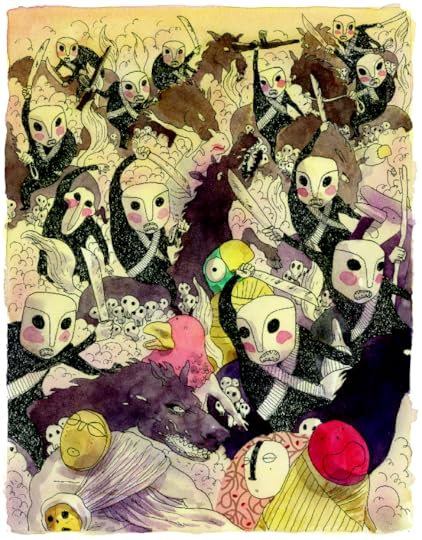 Hippolyte makes a stylistic choice to have the traveling characters wear masks to hide their faces. The masks have features but hide expression. Their bodies are draped and hidden. By contrast, other characters have their faces bare or, weirdly, exist at a whole other scale--there are a surprising amount of giants in the book.