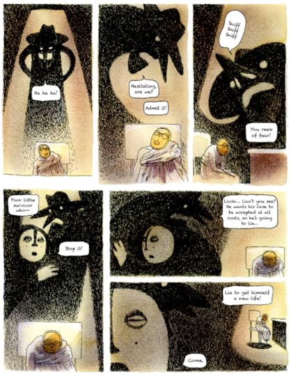 A refugee in a stark Alice in Wonderland meets Kafka type world sits before a bureaucrat telling his story of hardship. Those who died along the way appear as shadows encouraging him to tell the truth instead of embellishing. I know a lot of others found this very emotional but the art and story were so odd that I couldn't get into it. The oddities more of an impact on me than the situations.
