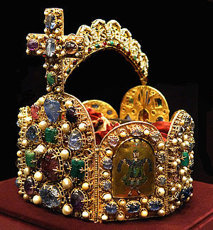 (The imperial Crown of the Holy Roman Empire - on the right side of the arch it is written: ROMANORU(M) IMPERATOR AUG(USTUS). Made for Otto the Great, of clear Byzantine inspiration; kept in the Imperial Treasury at the Hofburg Palace in Vienna)