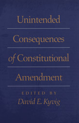 Constitutional amendments, like all laws, may lead to unanticipated and even undesired outcomes. In this collection of original essays, a team of distinguished historians, political scientists, and legal scholars led by award-winning constitutional historian David E. Kyvig examines significant instances in which reform produced something other than the foreseen result. An opening essay examines the intentions of the Constitution’s framers in creating an amending mechanism and then explores unexpected uses of that instrument. Thereafter, authors focus on the Bill of Rights and subsequent amendments, addressing such subjects as criminal justice procedures, the presidential election system, the Civil War’s impact on race and gender relations, the experiment in national prohibition, women’s suffrage, and, finally, limits on the presidency. Together these contributions illuminate aspects of constitutional stability and evolution, challenging current thinking about reform within the formal system of change provided by Article V of the Constitution. Forcefully demonstrating that constitutional law is not immune to unanticipated consequences, the eight scholars underscore the need for care, responsibility, and historical awareness in altering the nation’s fundamental law.