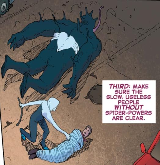 Seriously, though, this book is not only one of the better Secret Wars tie-ins, it's also an epilogue of sorts to the awesome Spider-Verse story that ran in the Spidey books last year. It's also a lot of fun and has nice artwork.