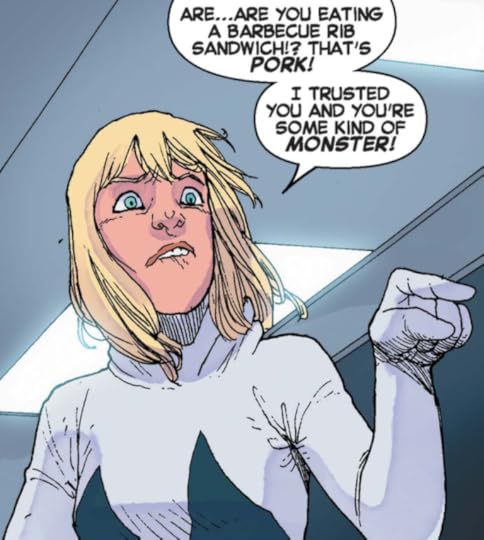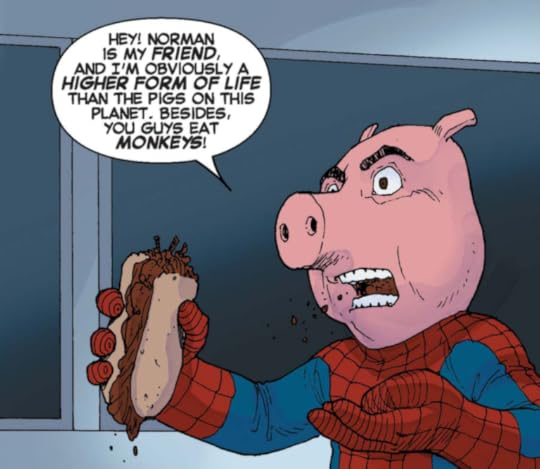 Also, Spider-Ham is in it. So... yeah. You owe it to yourself to read about a Pig that has the powers of a spider--- and eats hotdogs. YEAP.