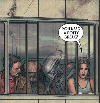 The way the stories intertwine and move between four different focal points—Prometheus, Aliens, Alien vs. Predator, and Predator, makes the story quite engaging. The art style also changes from focal point to focal point, and it makes sense within each ramification, but it is not such a jarring change that renders the four viewpoints completely incompatible with each other. Prometheus is just as terrifying and haunting as it needs to be, inspired by H.R. Giger's style which is remains the guiding light of the franchise, while Aliens has a style more adept to the work of James Cameron, while Alien vs. Predator and Predator are the more-cartoonish of the bunch (I've never been the biggest fan of Predator, but I respect the franchise, and I'm looking forward to Shane Black's upcoming film).
