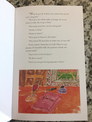 I enjoyed the paintings very much, but found the writing to be less of a memoir and more of a scattered list of meals and menus, bits of conversation, and visits to museums. I would have found that far less annoying if the author didn't assume that if one is reading a book that takes place in France that it means that the reader must be fluent in French. I was able to follow some of the snippets of conversations, etc., but felt seriously left out by others, which seemed needlessly exclusionary.
