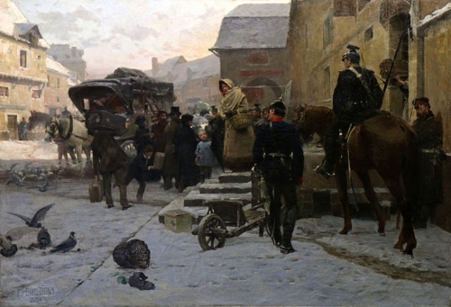 This is a short novel, it reads almost like a play. In 1870 while Prussian military occupies Rouen, some bourgeois citizens attempt to flee the city by stagecoach. The stagecoach and an inn are the settings of the tale. The passengers: A wine merchant and a clothier and their wives, a Count and his Countess, two nuns, a politician and one woman of those called of a light moral, Boule de Suif (grease ball) so nicknamed for her rounded appearance. In the first part of the journey, all the occupants will abusively enjoy sharing generous Boule de Suif's food basket. On a checkpoint, a Prussian officer holds the coach in hostage, unless he can have a lady to share the night with him. All the coach passengers force Boule de Suif to submit to this demand. Next morning however when the journey continues, all show her they're despising her, and now, no-one proposes to share their food provisions with the hungry young person. Boule de Suif stays in the corner of the coach on her own and cries.