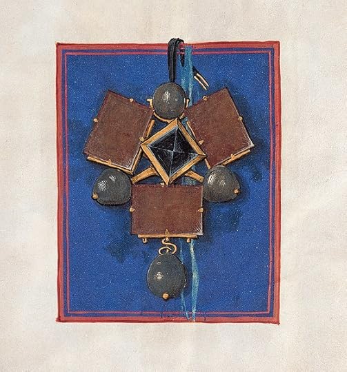 This being the jewel called The Three Brethren/The Three Brothers: "a triangle of gold. A medieval design, from Burgundy. A knot as big as the palm of my hand. Gold set with eight stones. One diamond, three rubies, four pearls."