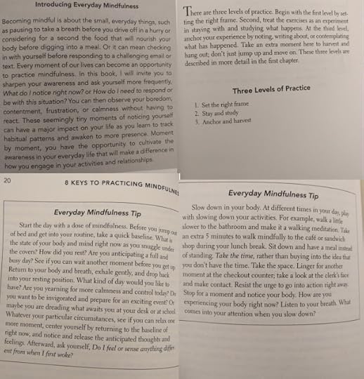 I could have lived with less stories, but I understand why she included them. This is a very practical guide to practicing mindfulness. It takes a lot of the unapproachable stuff out of it and breaks it down to each steps. As someone that is skeptical about meditation and the imagery sometimes used, I only found myself rolling my eyes a few times. I'm new to the idea of mindfullness and I'd definitely recommend this to another novice like me.