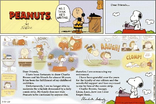 Schulz was asked if, in his final Peanuts strip, Charlie Brown would finally get to kick the football after so many decades (one of the many recurring themes in Peanuts was Charlie Brown's attempts to kick a football while Lucy was holding it, only to have Lucy pull it back at the last moment, causing him to fall on his back). His response, "Oh, no. Definitely not. I couldn't have Charlie Brown kick that football; that would be a terrible disservice to him after nearly half a century." But in a December 1999 interview, holding back tears, Schulz recounted the moment when he signed his final strip, saying, "All of a sudden I thought, 'You know, that poor, poor kid, he never even got to kick the football. What a dirty trick—he never had a chance to kick the football.'"