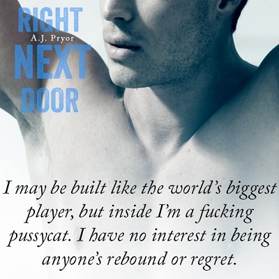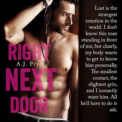 Right Next Door is a standalone and isn’t part of a series (so far). This is my first A.J. Pryor book. I will admit, it was insta-cover-crush to me. Hello abs right?
