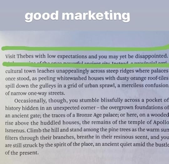 So yeah, not a bad book AT ALL. The research was very thorough, the myths descriptions short and crisp, and it's probably a fantastic book for anyone traveling in Greece who's hellbent (or just, you know, interested on a normal level) on visiting important mythical and historical locations. But since I'm not that type of person, I could've done very well, one would say even better, without all the focus on geography that was the whole purpose of writing it. Would still recommend if you're into Greek myths!