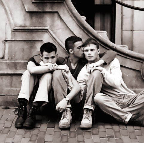 Photo Description: Three young men sitting on a cobblestone street with their arms around each other and melancholy expressions. The man in the middle is kissing the cheek of the man on the right, while the man on the left is resting his chin on his knee.