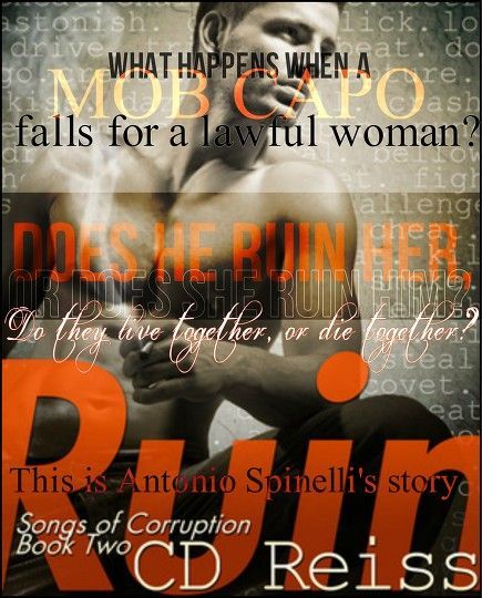 RUIN: Antonio is a real passionate man, "my job is to eff you until the neighbors think I'm murdering you." I kissed his cheek, his chin, his lips. He was erect in less than a minute." I felt bad for Antonio and Theresa there were times I just wanted them to have normal in their lives, "but next time we go to a wedding, the worst that will happen is you get too drunk to dance." I mean if their story was normal it would be a boring read and these two are far from boring. I also wished Antonio would have given Theresa more credit she's a lot stronger than what he gave her. I enjoyed this book and am ready for a part 3.