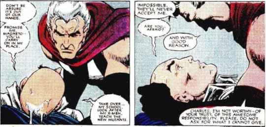 My X-Men comics diet for 2015 will consist of many titles from here on, and they're not going to be read and reviewed by me in chronological order so things are going to get topsy-turvy for everyone, timeline-wise, but I promise to find a way to make everything as cohesive, comprehensive and understandable as much as I can. This title picks up after the events in Claremont's other title The Uncanny X-Men where I believe Professor X has just passed away in Magneto's arms reminiscent if not directly the inspiration of that bromantic beach scene in the X-Men: First Class film. I'm not exaggerating; it's a particularly homoerotic stirring scene where Professor X made Magneto promise to take over the school and handle the mentorship of the X-Men. To ease his friend's passing, Magneto acquiesced.