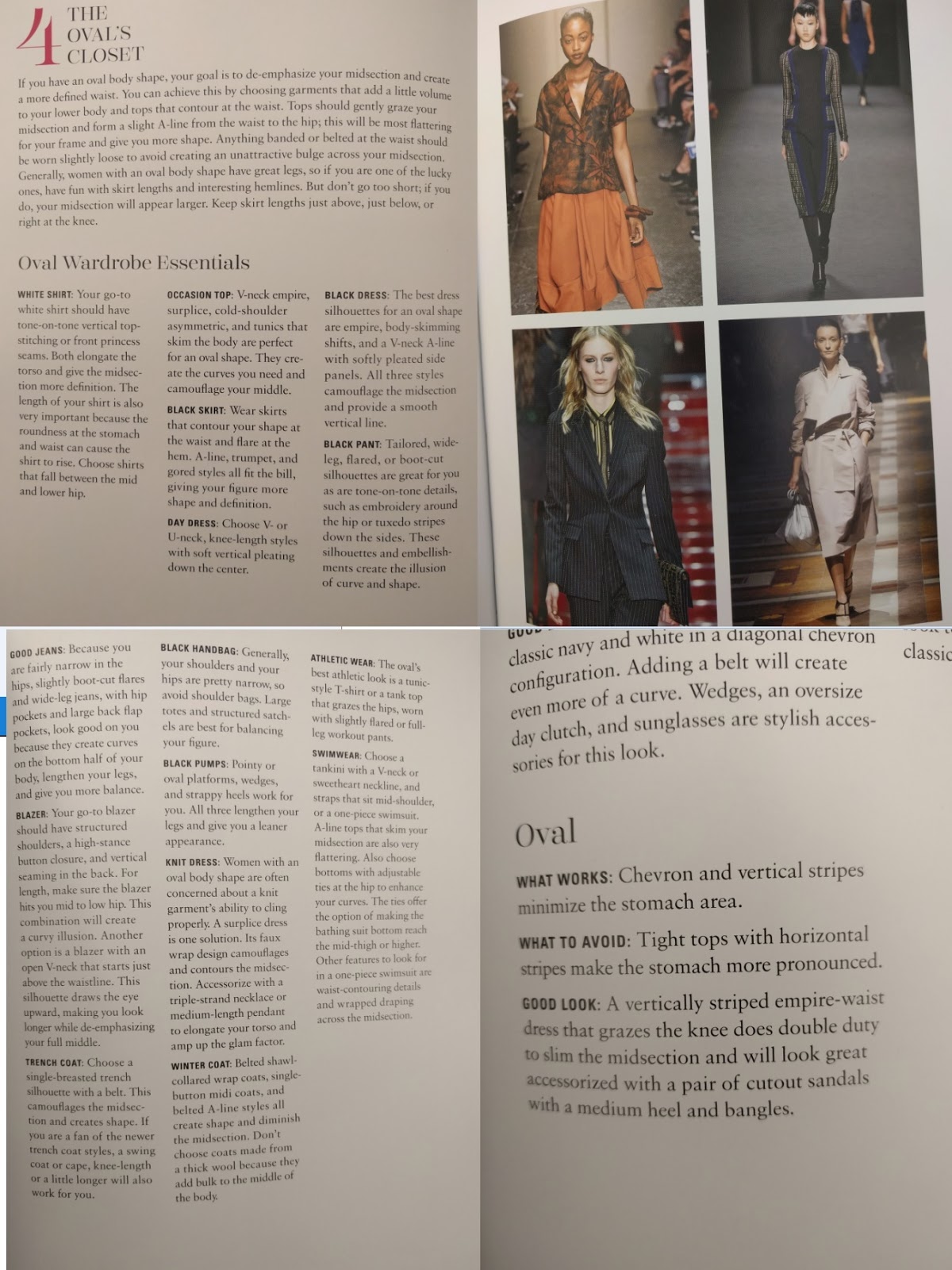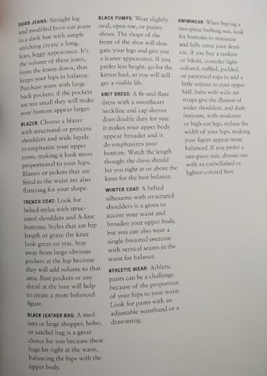 This is good for ideas, but take everything the author says with a grain of salt. I found her contradictory. She offers advice to be yourself, and makes recommendations for the correct silhouettes at the same time.