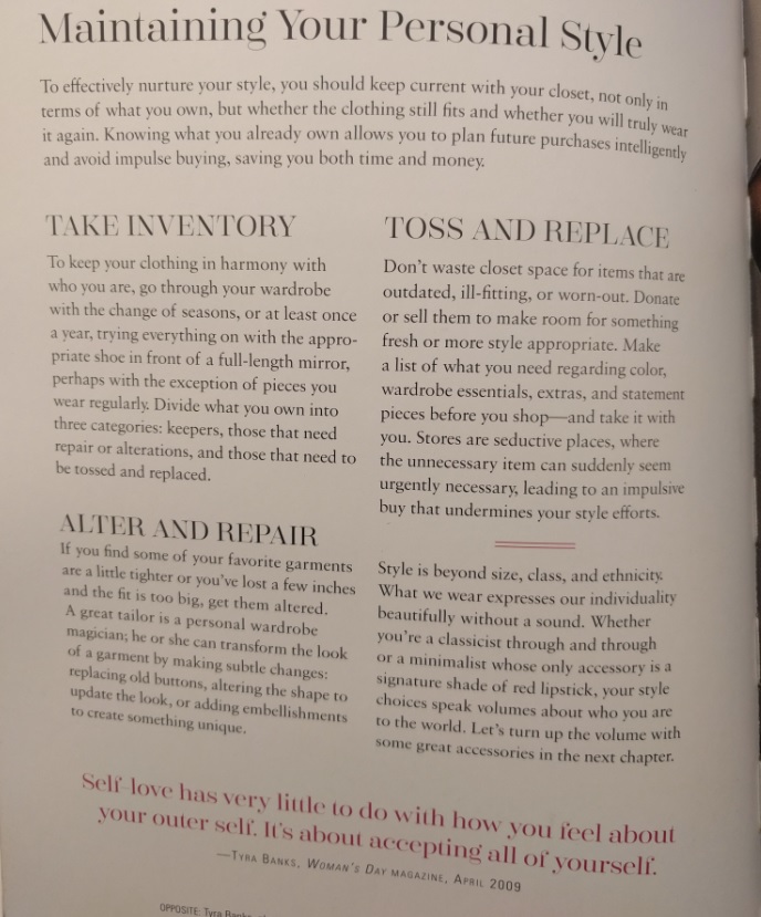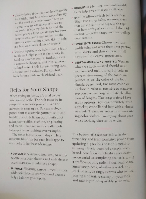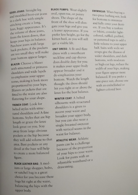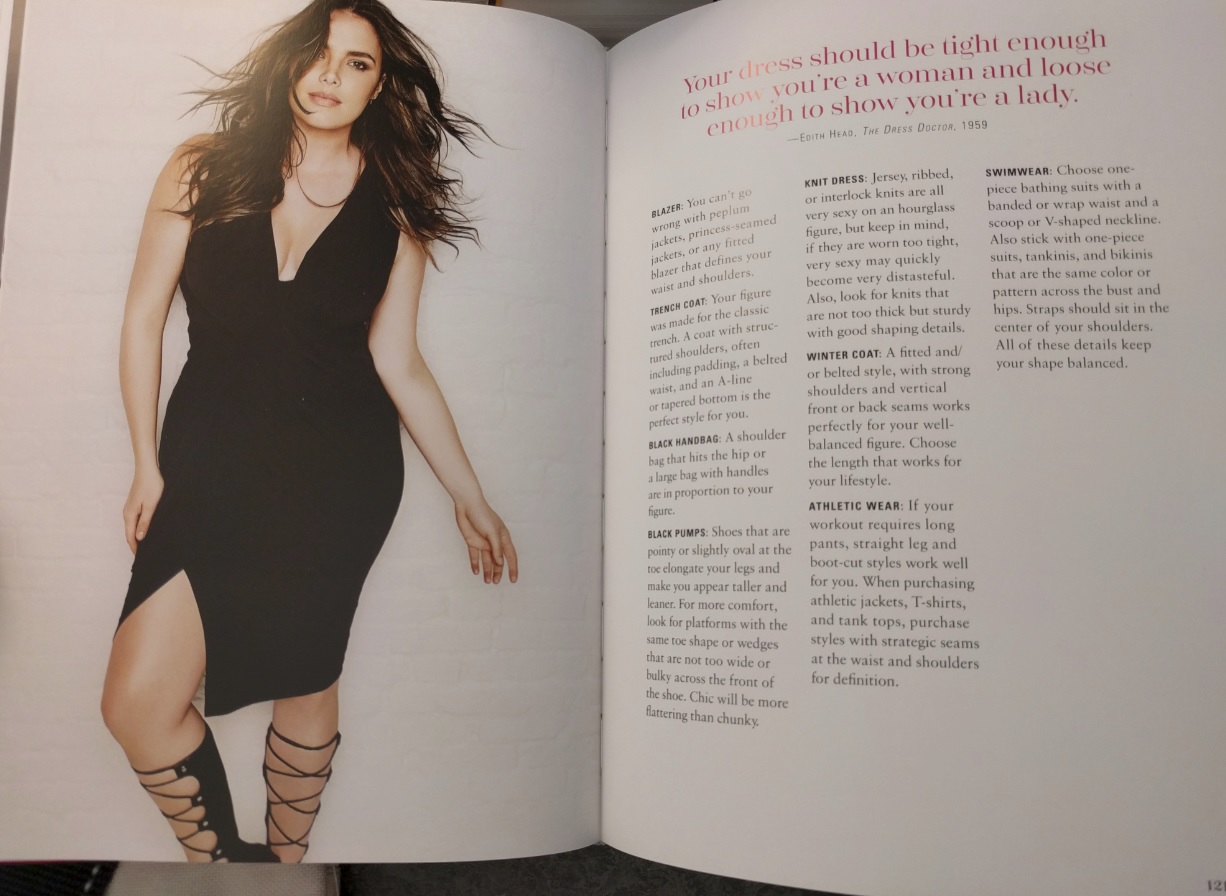It’s a decent style guide, but it’s nothing revolutionary. I knew many of these fashion tips and tricks on my own. Probably the most useful part were the tips on shape wear and fittings.