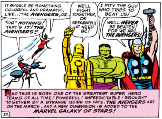 Hilariously outdated, but still fun to read, the way these guys decide to team-up cracked me up. Ant-Man: "Hey guys, why don't we team-up?" the other guys: "Sure, why not?" and the AVENGERS were formed! Simple times! xD