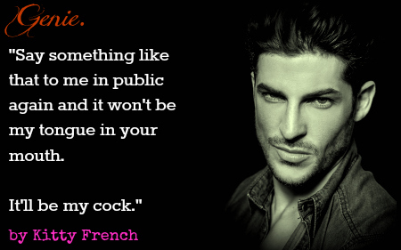 I really enjoyed this – it’s light, funny and very, very sexy. Kitty French’s style is engaging and compelling and the story held my attention from beginning to end even if I did want to kick Abel’s arrogant arse on more than one occasion. It’s written as a standalone but I do think there’s scope for one of the secondary characters to get a story of their own so hopefully we haven’t seen the last of Abel and Genie.