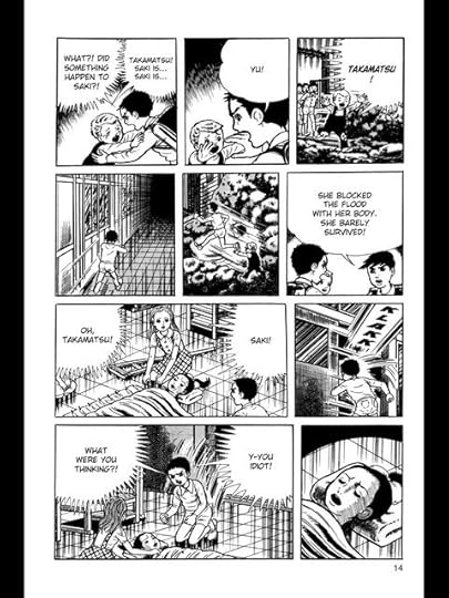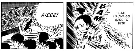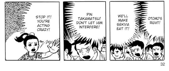 Umezu's drawings are the most storyboard-like of any of the manga artists I've read. His action sequences, consisting almost entirely of dark pages with kids grappling, shattering wood, raised weapons, and close-ups of kids shout "aaaargh" and "gyaaah" are genuinely exciting in their own ridiculous way. When Yoshikawa, formerly one of the good kids, eats mushrooms and goes down on all fours to scurry out of the schoolyard to her new god, it is genuinely creepy. Takamatsu, the cafeteria man, who has gone from a threat to a retarded man child, and now back to an incredible danger, looks like a deranged, overweight Desi Arnaz. Now that's the very essence of horror.
