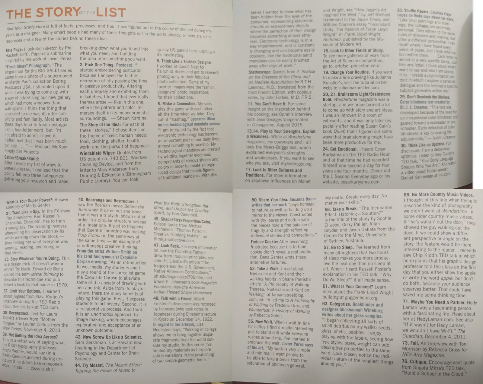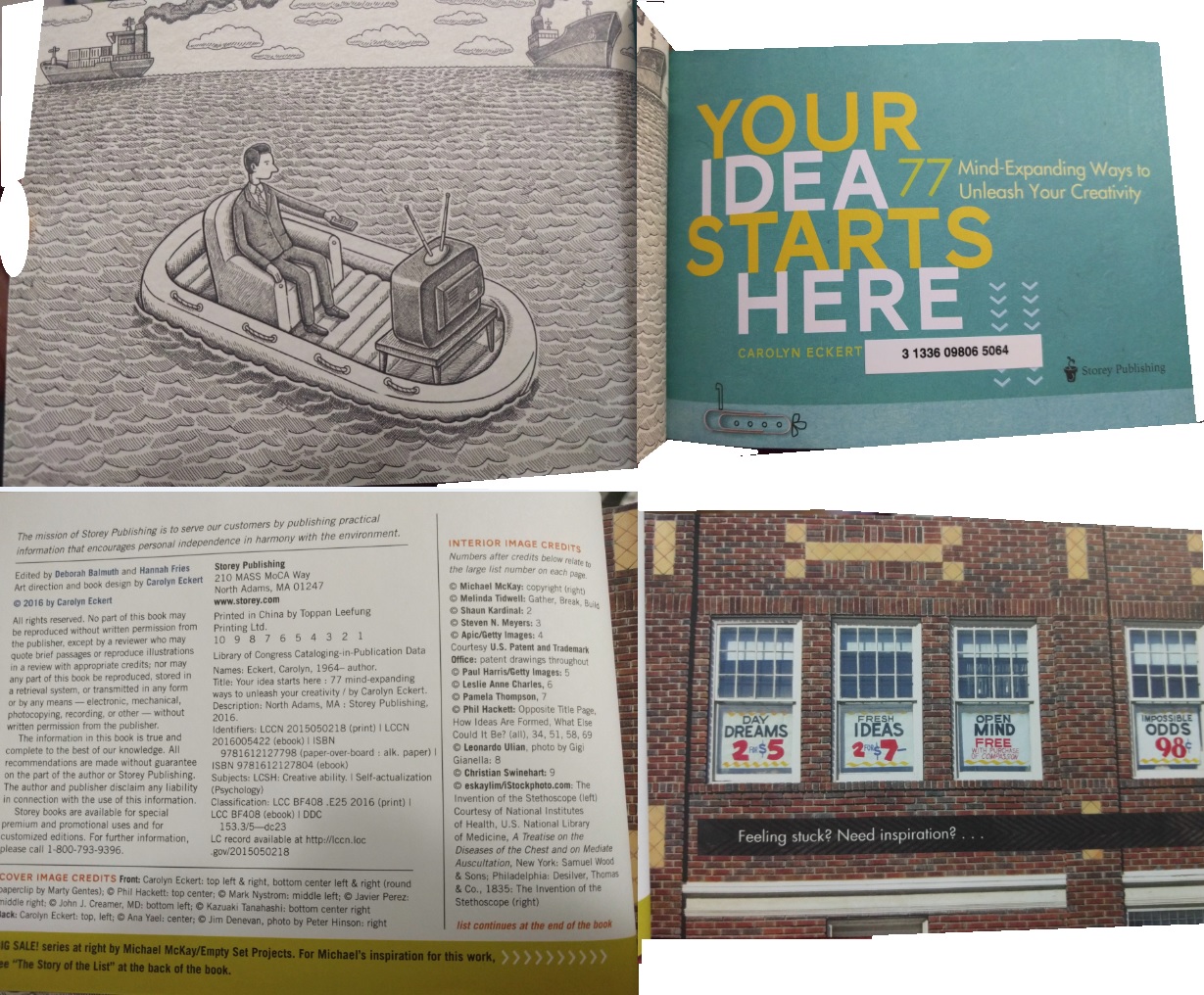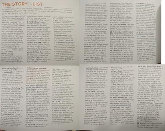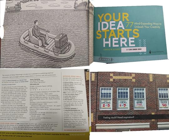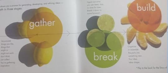 This book contains 77 ideas about what to do with ideas in the beginning middle or ending stages. There are ideas like recycle, share, wait, critique... and others that I won't give away in this review. You can view a preview of this book on Amazon or on Storey.com. For each idea about ideas, there is a graphic and description of that idea. Many interesting stories are included about little inventions that have changed our lives. I could flip open anywhere in this book and smile. I do not generally like modern art, yet most of the graphics in this book are just that--modern art. And I love them! I genuinely enjoy looking at this book--at the lines, composition, shadows, color, and subjects of the graphics. My husband also enjoyed looking at all the pictures. One thing which occurred as I read this book was that I laughed out loud often or at the very least smiled regularly in my reading.