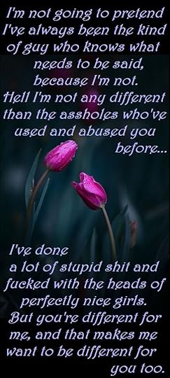 “I’m not going to pretend I’ve always been the kind of guy who knows what needs to be said, because I’m not. Hell, I’m not any different than the assholes who’ve used and abused you before. I’ve done a lot of stupid shit and fucked with the heads of a lot of perfectly nice girls. But you’re different for me, and that makes me want to be different for you, too.”