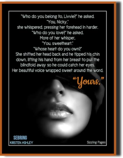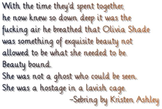 "You mean more to me today than you did yesterday."-NickTold in dual POV, Sebring was a good addition to the series. Both Liv and Nick are quite complex and their interactions were natural and quite enjoyable to read. The underlying tension of Nick's secret drives the action throughout. The brutality of the Shade family enhanced the story because the fear was real and the emotions that evoked were intense. Additionally, the progression of the relationship between Nick and his brother Knight (I love that man) was nothing short of perfection. The two brothers coming together after years of turmoil brought a satisfying spark of joy! The story was well crafted and very sexy. My only setback in this read was that I did feel like Liv's transformation was a bit abrupt towards the end. Still, I was quite pleased with how things turned out!
