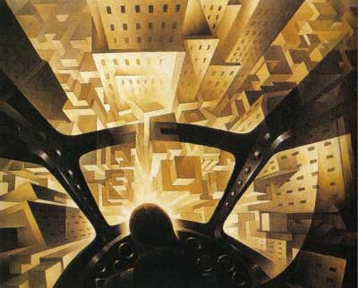 There's also a military aspect to it, not the least because these urban landscapes would, time and again, be targets. A 2005 art exhibition could show a futuristic 1939 painting, Tullio Crali's "Nose Diving on the City," and not really ponder its implication, that such an urban view in 1939 would be that of a dive-bomber pilot.