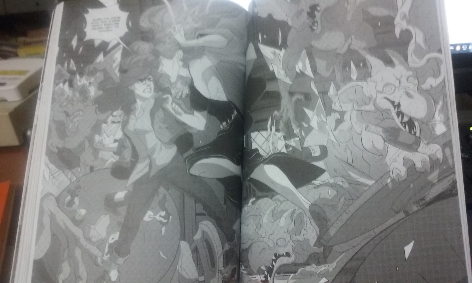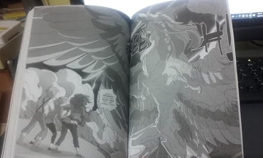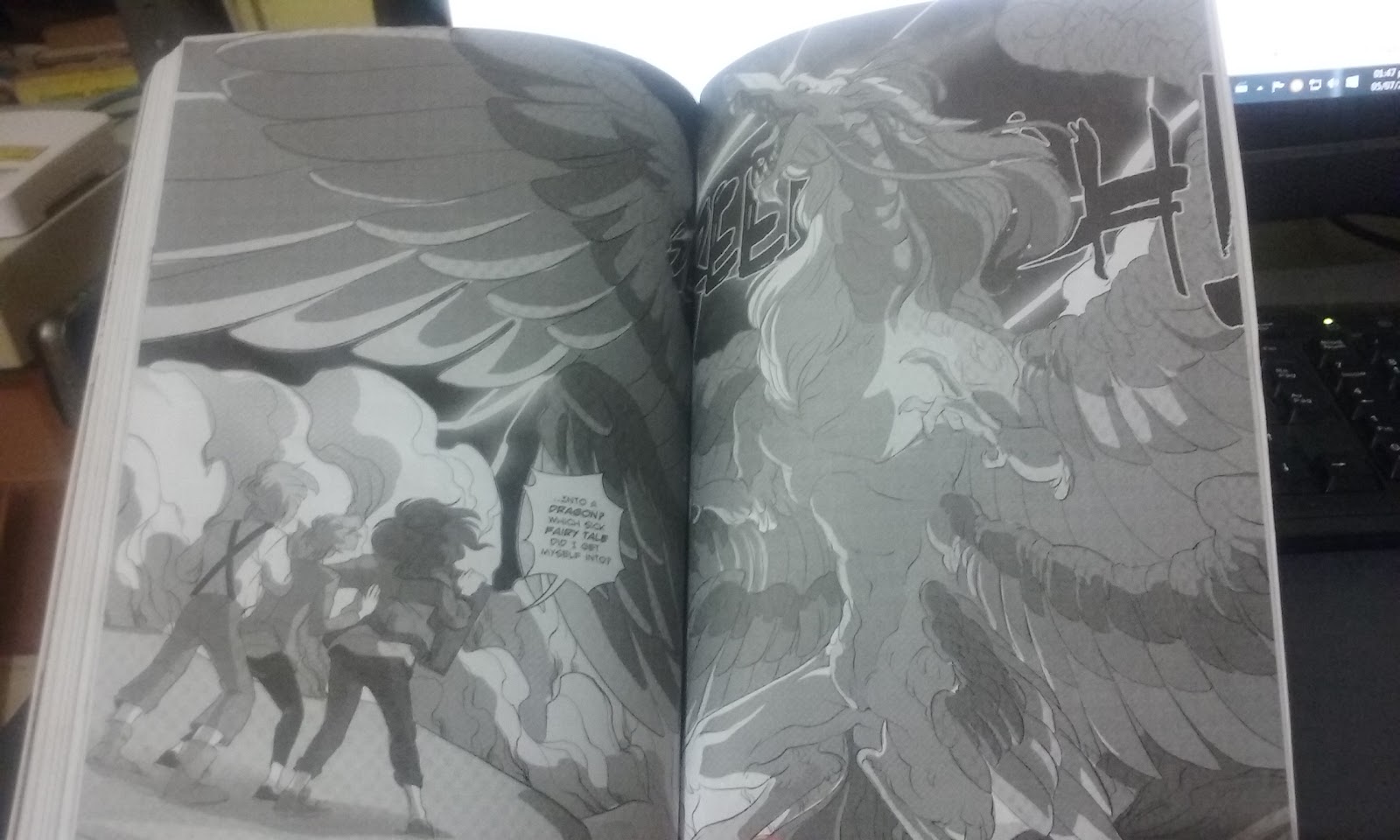 El arte me pareció bueno, el dibujo recuerda un poco al estilo manga. Recuerda, porque no creo que sea ese estilo, la verdad. El comic está en blanco y negro y hay algunas escenas dibujadas a dos páginas que se ven bastante espectaculares. No voy a llenar la reseña de fotografías sólo por qué sí, vamos. Me gusta como se complementa el estilo de ambas escritoras, queda muy bien. En general creo que mi única queja tiene que ver con el ritmo de la historia, porque por el resto me parece una historia de fantasía bastante interesante y bonita. Además el principio es mi favorito porque me gustan las historias que te retan para que entiendas que está pasando, las que no son completamente líneales.