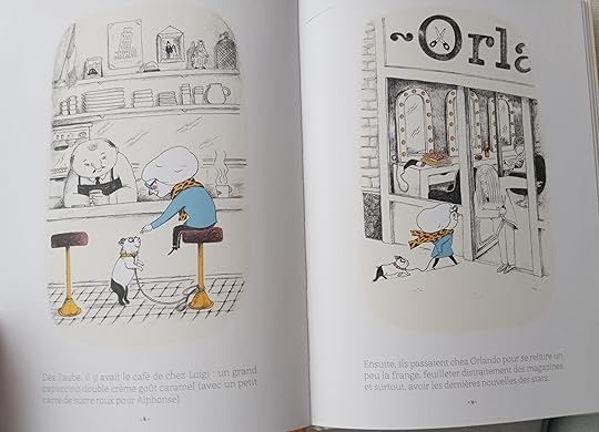 I love the artistic style of this book. The cityscape is lovely and Bigudi and Alfonso fit right at home in their little section of the urban metropolis. Bigudi and her dog Alfonso are regulars all over town and enjoy getting out and about doing their thing and visiting all their local spots.